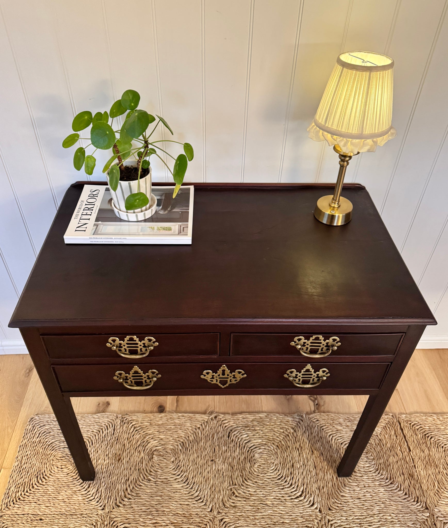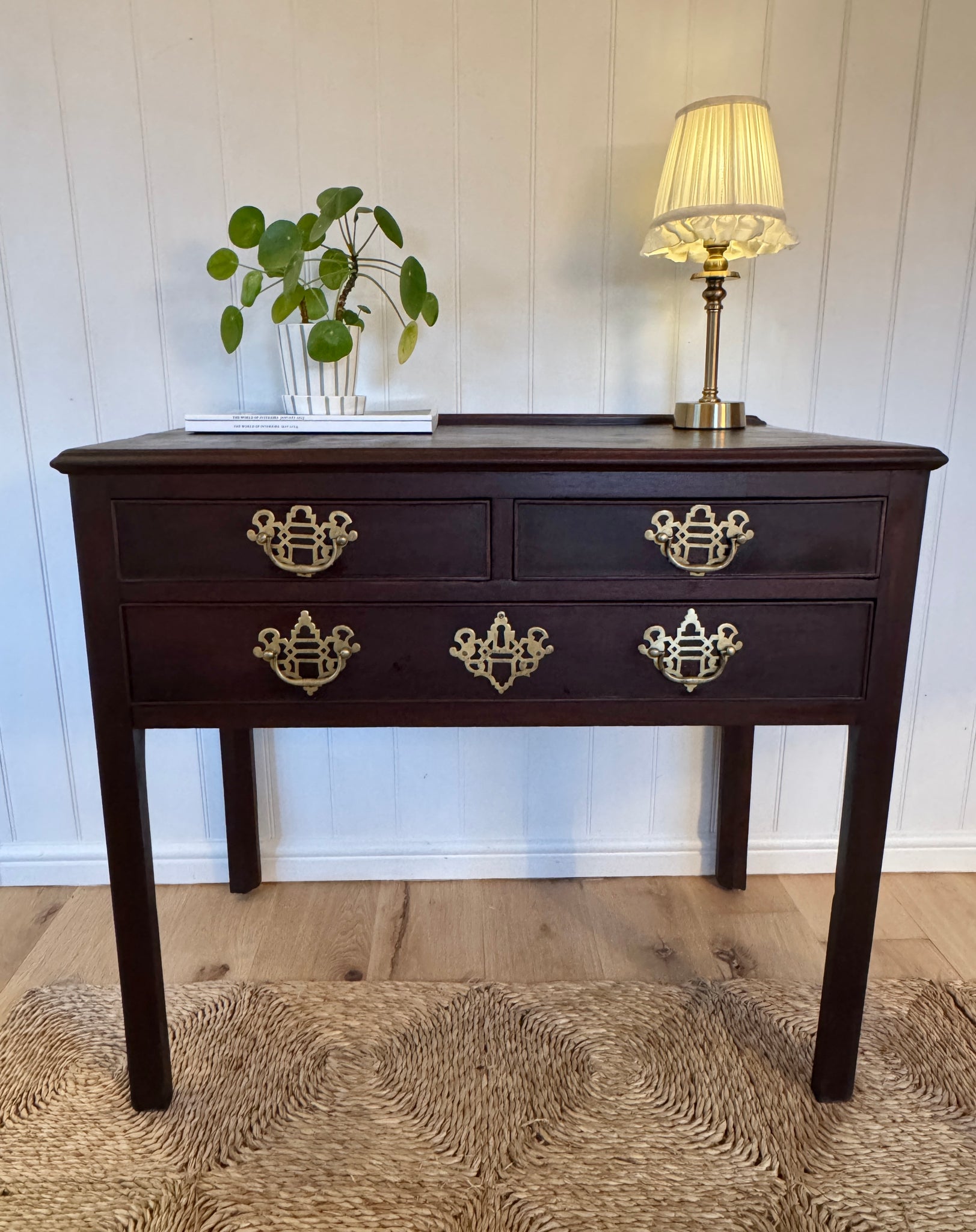 A charming antique Georgian low boy / console table in mahogany wood, raised on slender square legs. Featuring three drawers (two over one) with decorative pierced brass handles, giving a classic Georgian-style look.