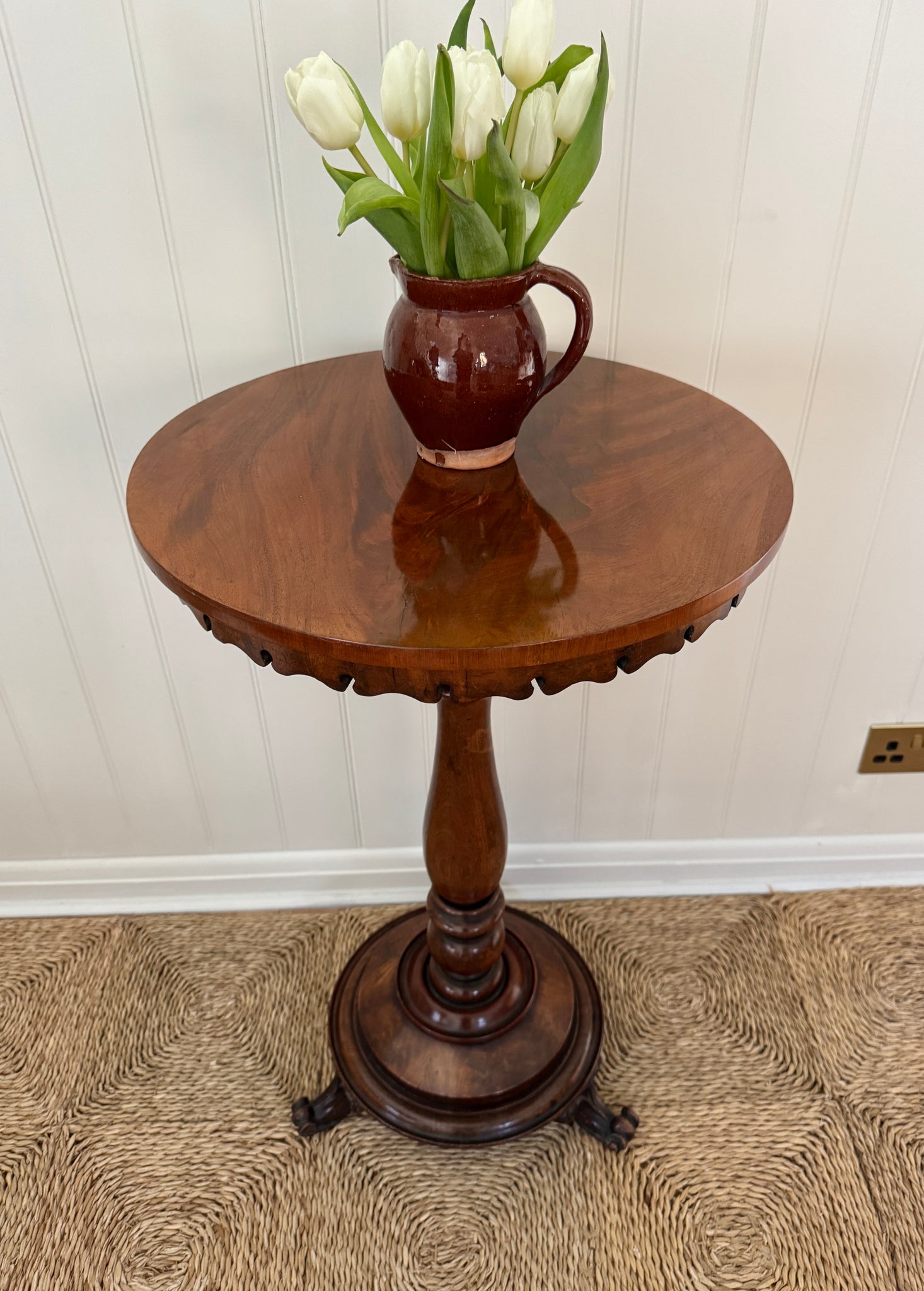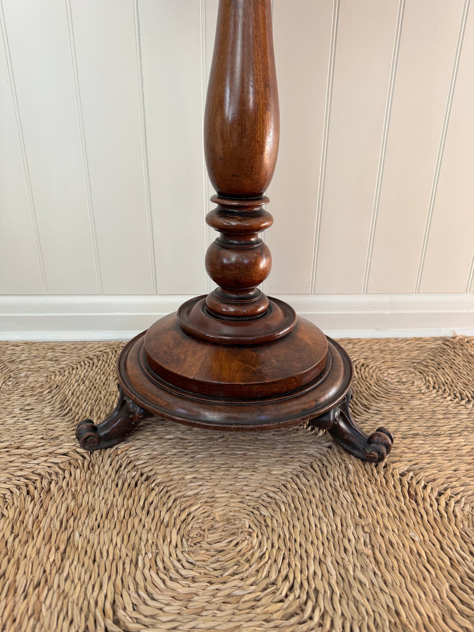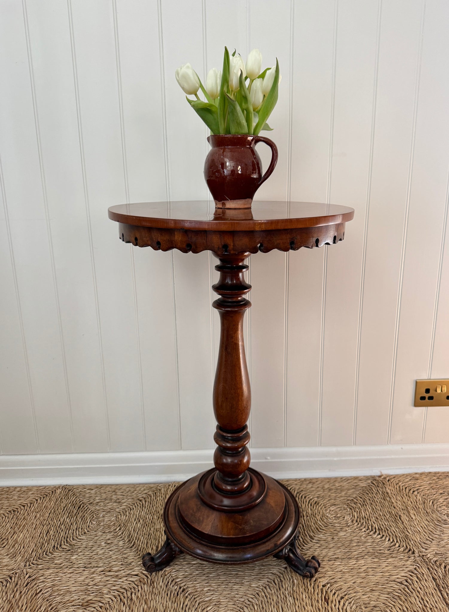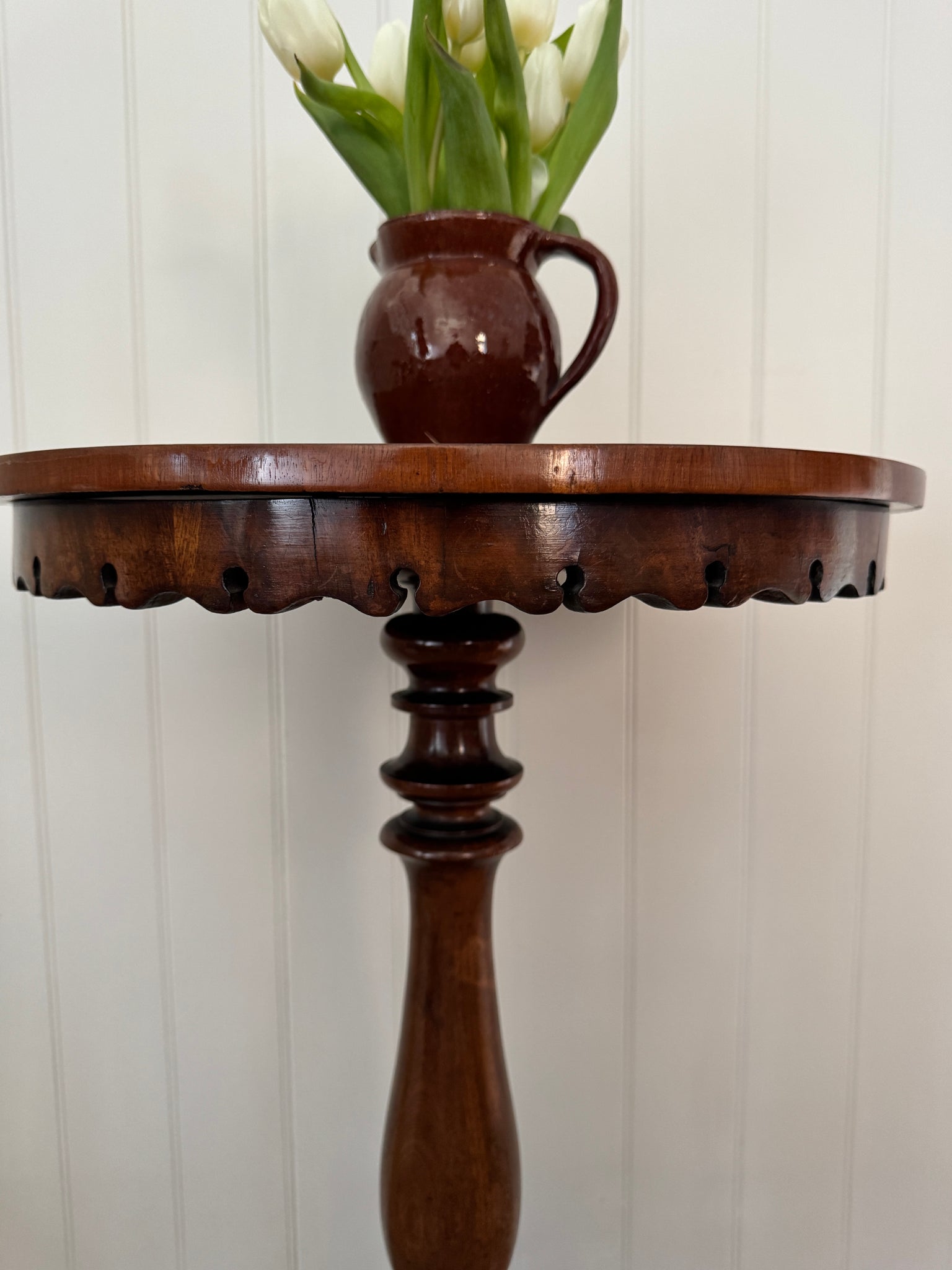 A charming antique mahogany pedestal table, beautifully turned from richly toned wood with a warm, polished patina. The circular top is supported by an elegant baluster stem, resting on a sturdy tripod base with gently shaped feet. Subtle age-related wear enhances its character and authenticity. Ideal as a plant stand, lamp table or occasional table. In beautiful condition and a real statement piece.