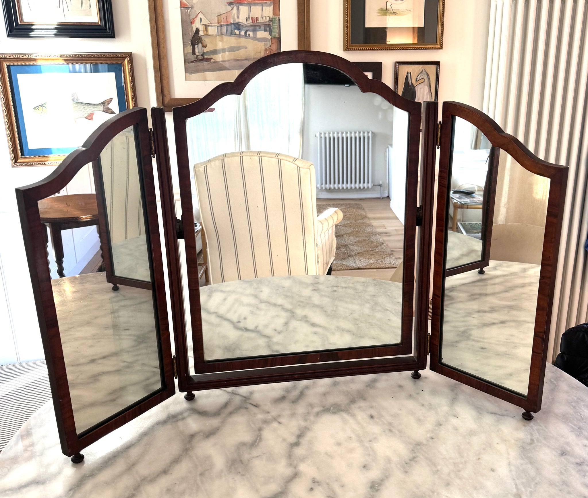 Edwardian mahogany triple dressing table mirror with shaped arched top and hinged side panels.