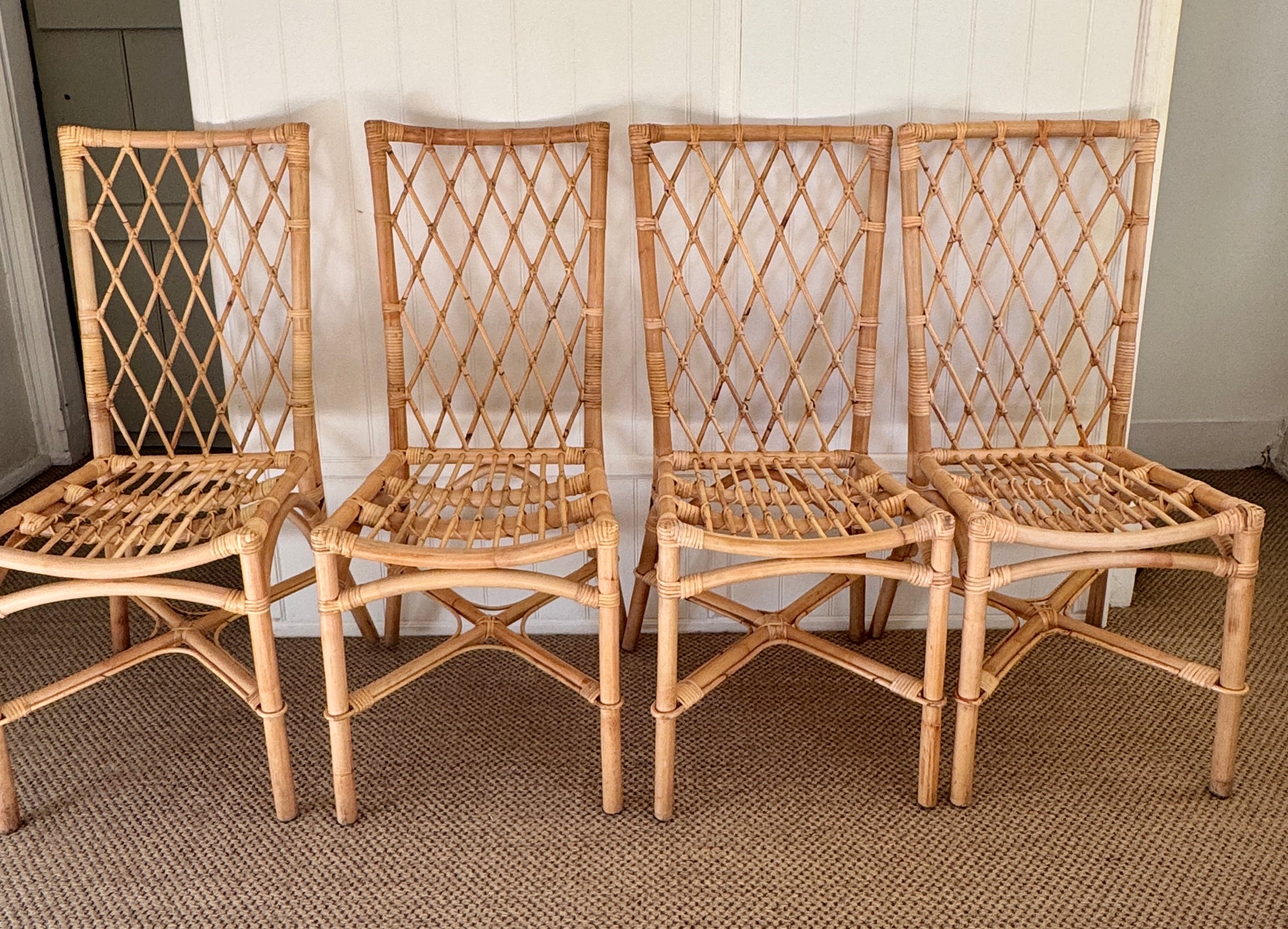 Set of four vintage bamboo & rattan dining chairs with lattice backs and curved seats. Lovely natural honey tone with cross-stretcher bases for added strength.
