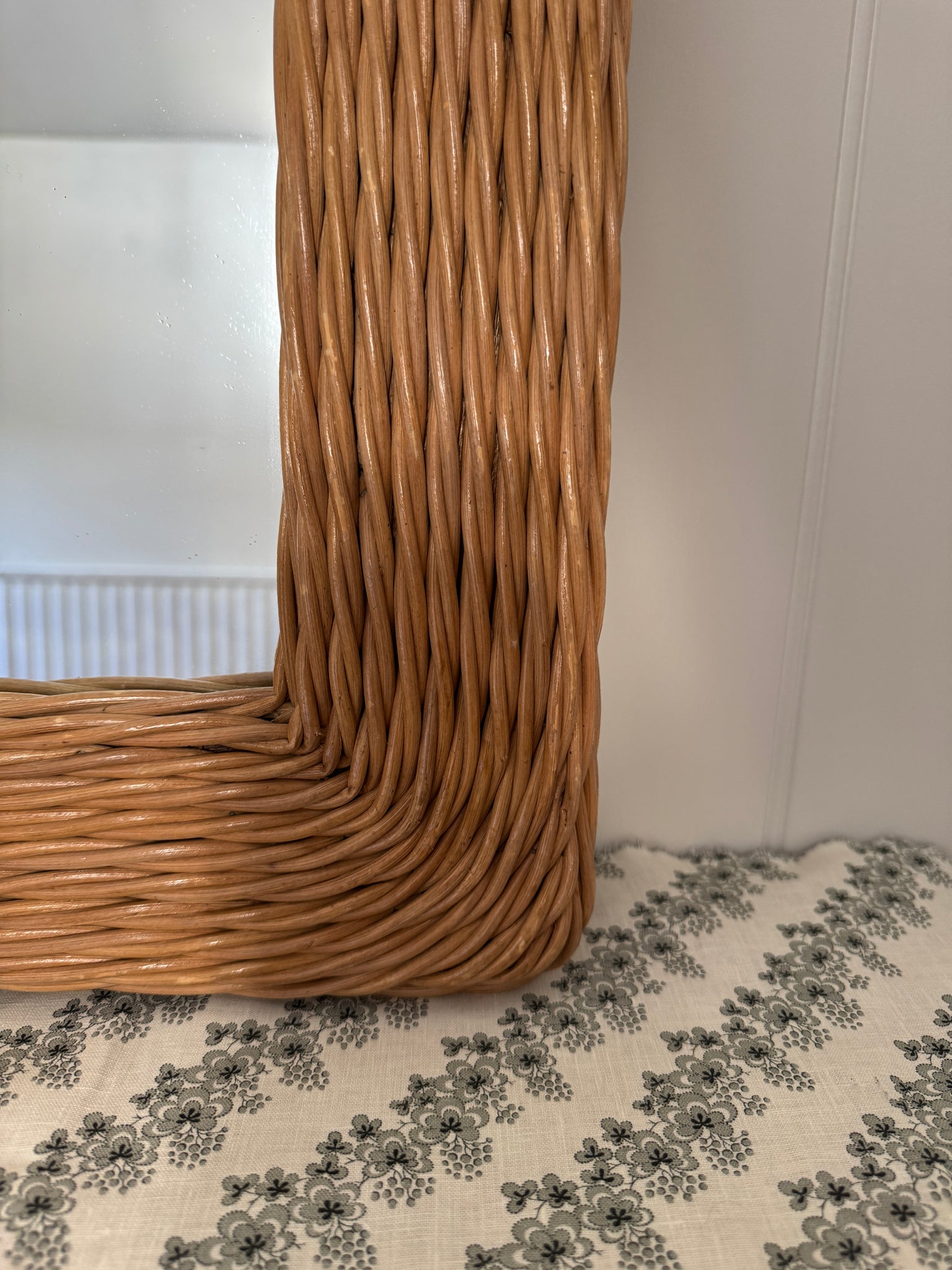 A popular style with interior designers, large vintage rectangular mirror with a woven rattan frame in a warm honey tone. The natural texture and softly rounded corners give it a relaxed vintage feel with light age-related wear adding to its character. A versatile piece, ideal for hallways, bedrooms or bathrooms.