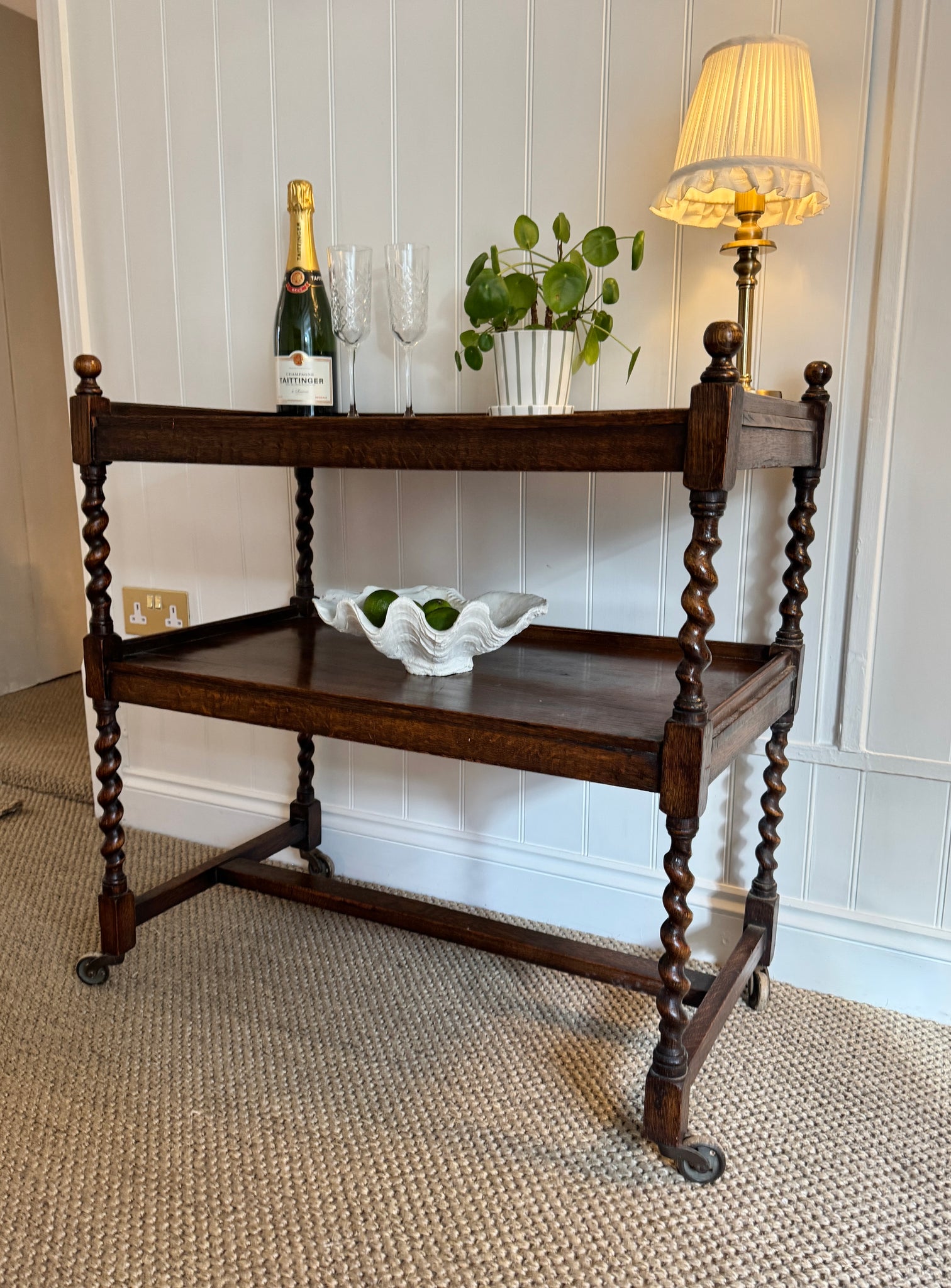 A charming mahogany barley twist, two-tier vintage bar cart, crafted in dark-stained wood with beautifully carved barley twist supports. Both shelves feature raised edges, perfect for displaying glassware, bottles, or decorative pieces. Set on smooth castors, this trolley is as practical as it is stylish, offering easy movement around your home.