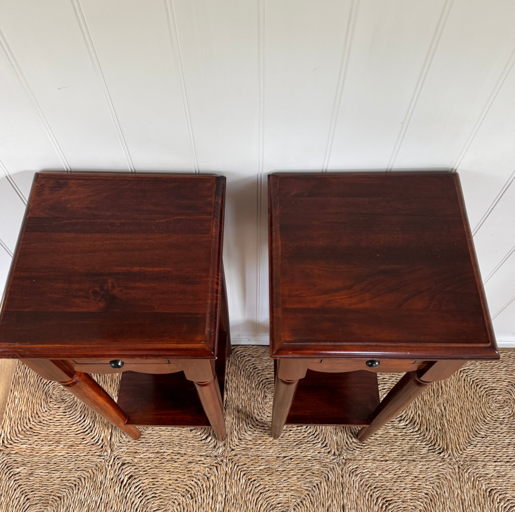 Beautifully crafted from solid mahogany, the pair showcases a rich, warm tone with a gently polished finish that highlights the natural grain of the wood. Their timeless design and compact proportions make them versatile additions to both classic and contemporary interiors — perfect in a hallway, living room, or beside the bed.