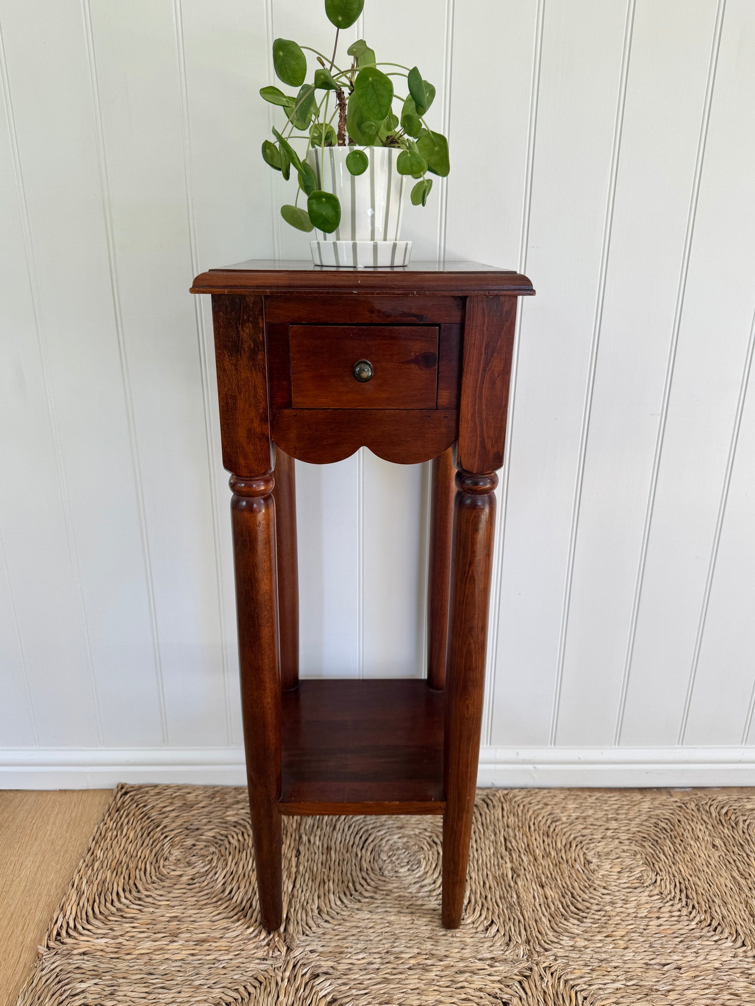 Lovely scalloped bedside table with handy drawer and lower shelf. These can also be used as great lamp or plant tables in hallways/bathrooms.