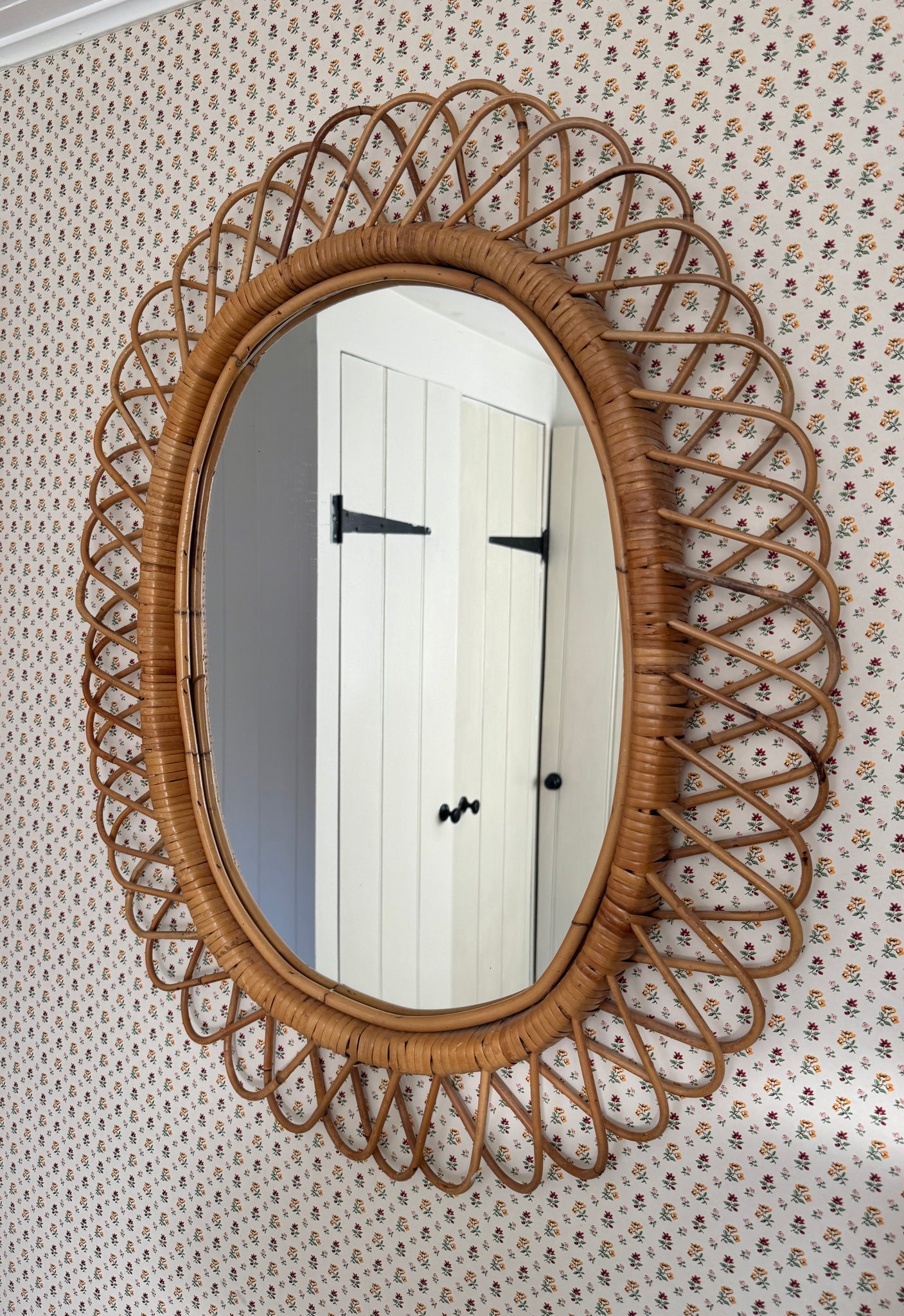 A stunning Italian rattan sunburst mirror, attributed to Franco Albini, featuring an elegant oval mirror plate framed by finely hand-woven cane and a sculptural radiating looped surround. The refined proportions, quality of craftsmanship and light, architectural form closely reflect Albini’s celebrated mid-century Italian designs.