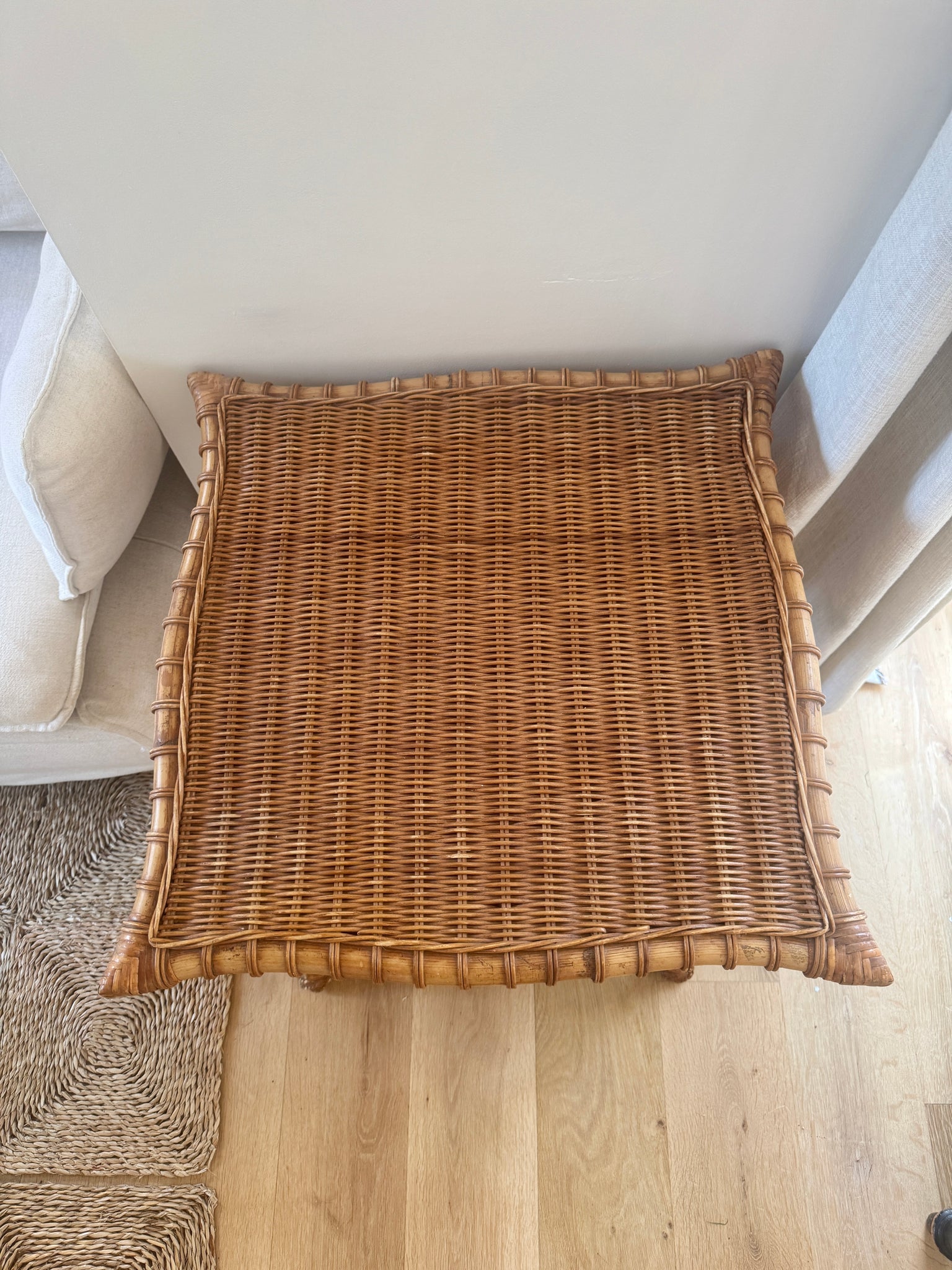 A charming vintage rattan side table featuring a beautifully woven wicker top and matching lower shelf — perfect for books, plants, or decorative pieces. The honey-toned rattan frame with its softly curved edges and detailed wrapped joints adds warmth and natural texture to any interior.