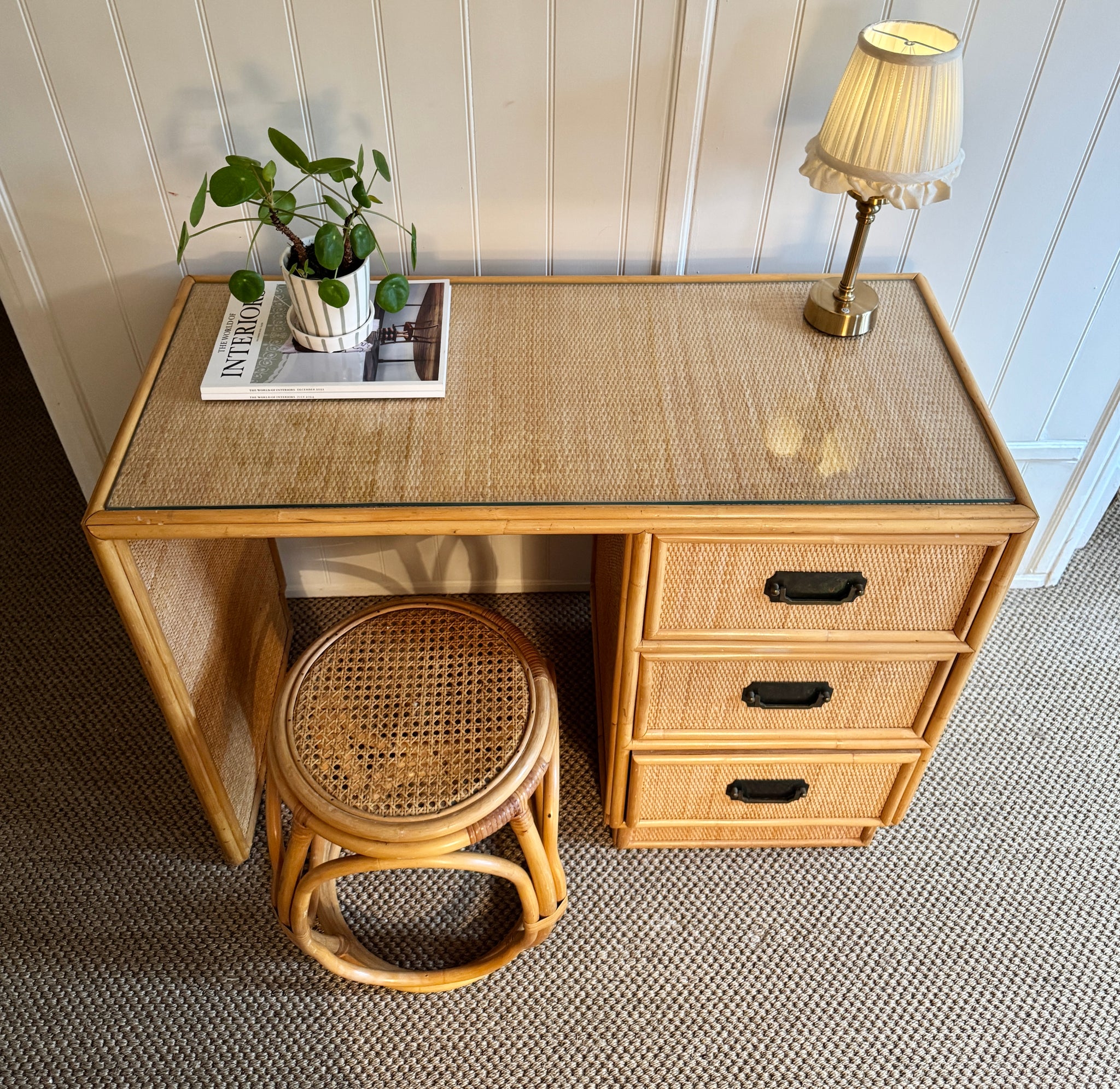 Beautiful vintage rattan and wicker desk with glass top, featuring three woven drawers with brass campaign pulls. Warm and clean, simple lines give it a classic 1970s vintage feel. A compact, tactile piece perfect as a writing desk or dressing table, in very good vintage condition with light wear consistent with age. Stool also included.