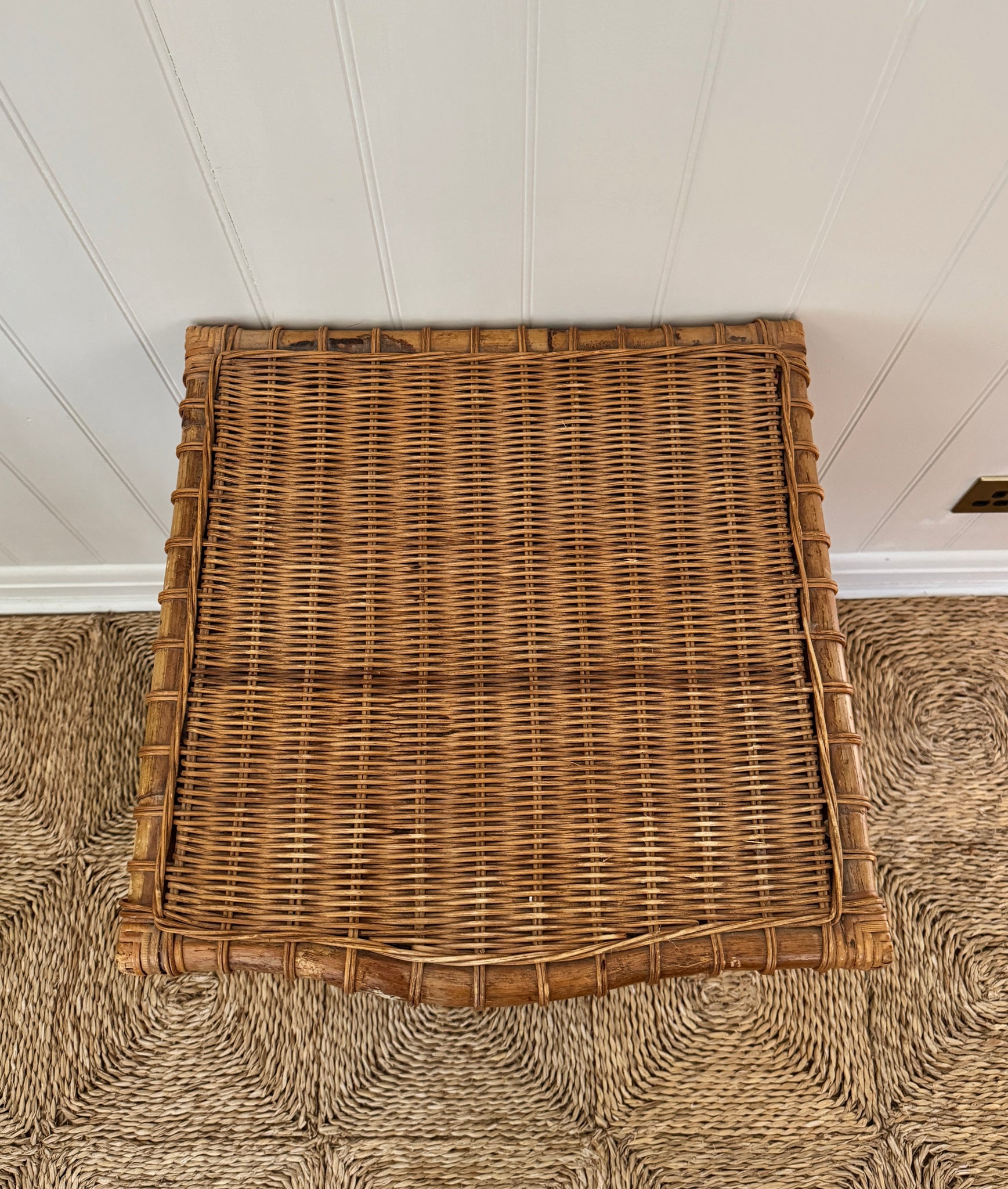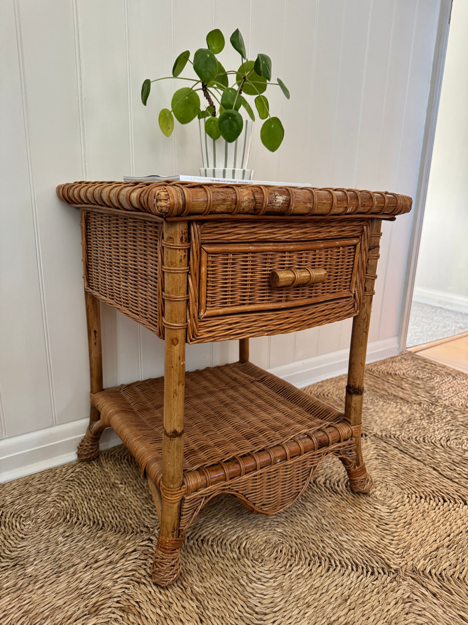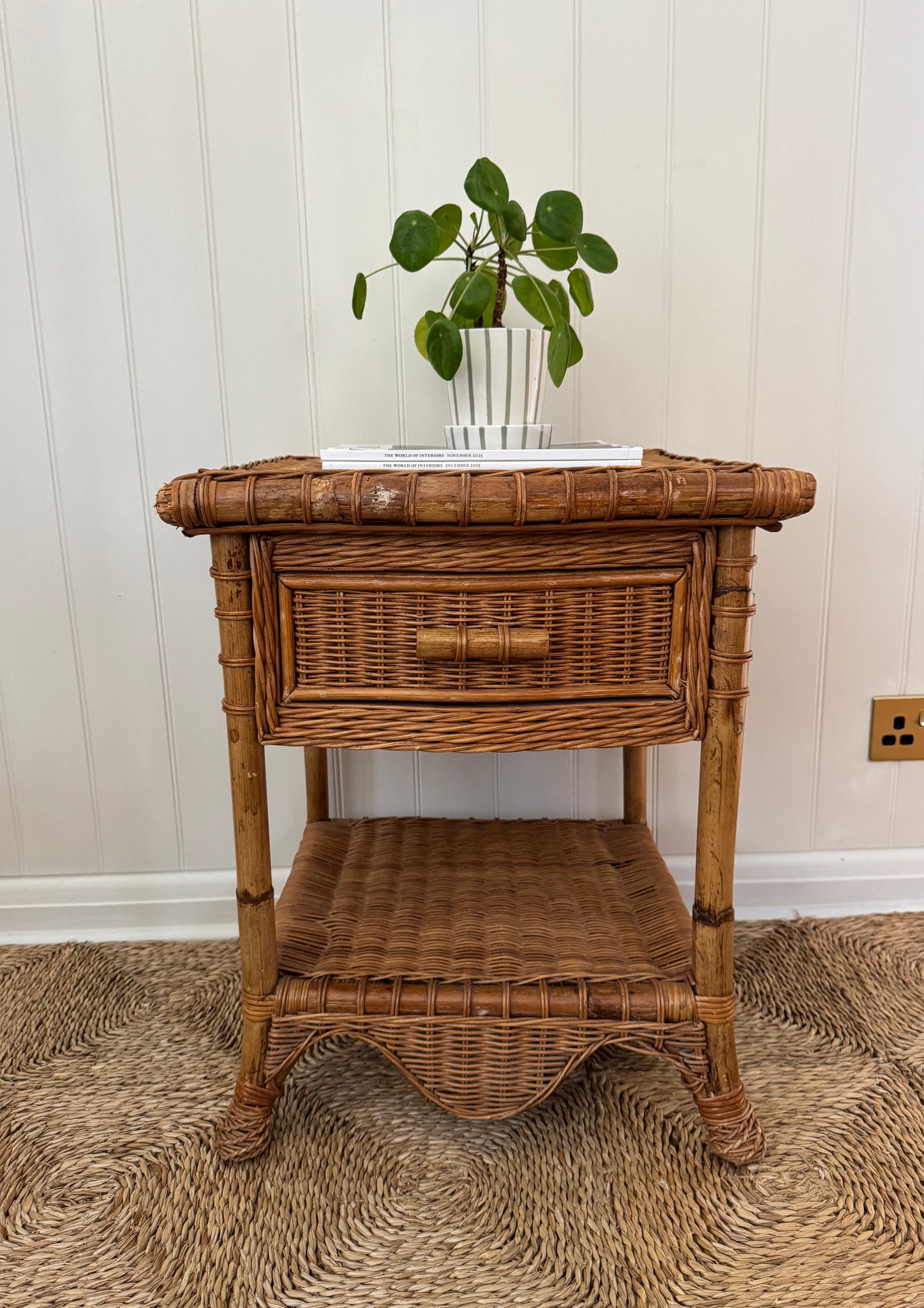 A very popular vintage wicker a faux bamboo scalloped skirt bedside/side table with handy drawer featuring a faux bamboo handle. These pieces are very popular with interior designers featuring in particular in nurseries and children’s bedrooms.